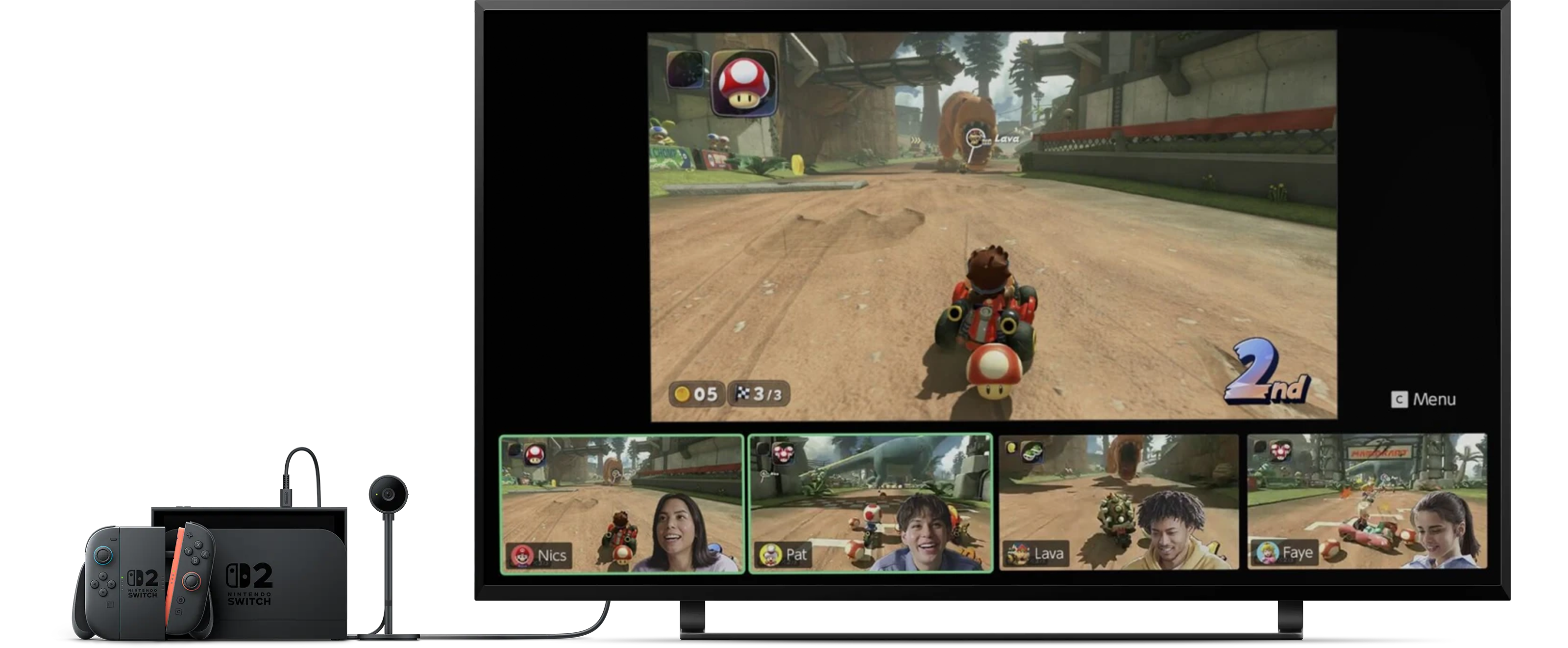 Tilslut et kompatibelt USB-C-kamera, fx Nintendo Switch 2-kameraet (sælges separat), for at videochatte og se hinandens ansigter, mens I spiller. Op til fire personer kan videochatte på samme tid.