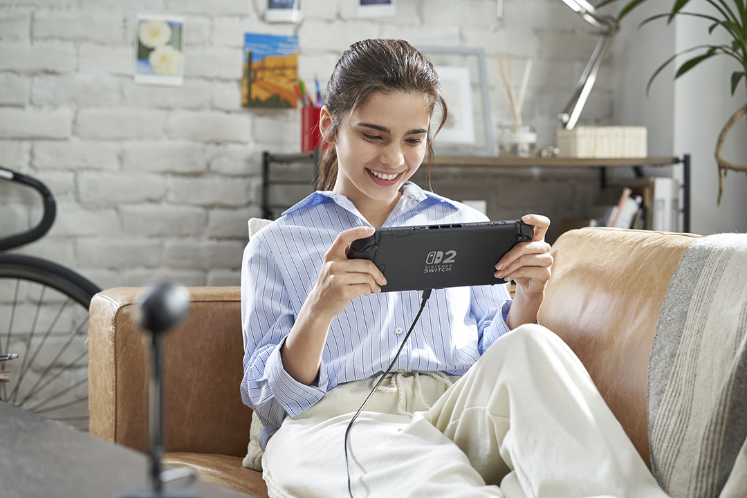 Nintendo Switch 2 har en indbygget mikrofon, som kan opfange din stemme, selv når du sidder langt væk. Den kan også filtrere omgivelsernes lyde fra, så din stemme går klart og tydeligt igennem.