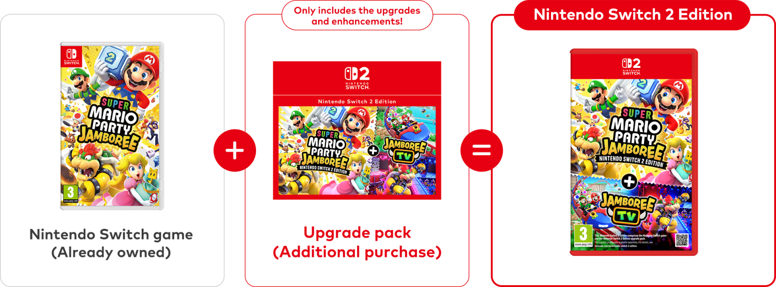 Hvis du allerede ejer Super Mario Party Jamboree til Nintendo Switch, behøver du kun at købe opgraderingspakken for at spille Nintendo Switch 2 Edition.